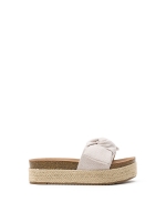 Eleve o seu estilo com estas plataformas de tiras largas cruzadas em tecido de lona com extremidades desfiadas e laço decorativo. Sola de cortiça forrada com tecido de juta e sola de borracha. Perfeitas para quem procura destacar-se da multidão.