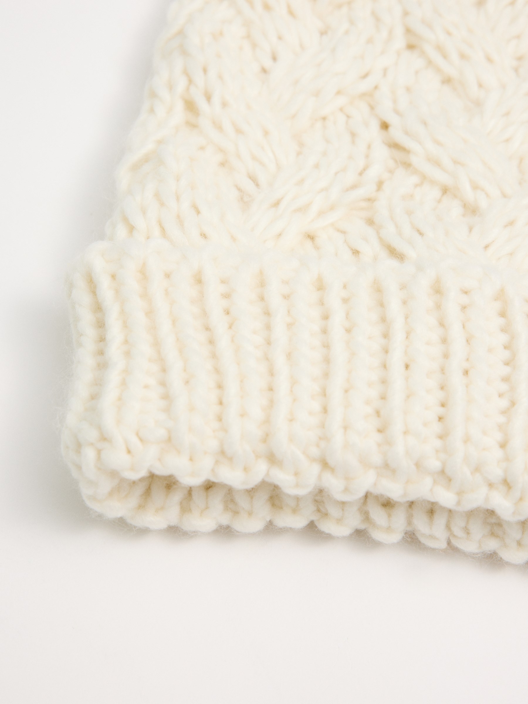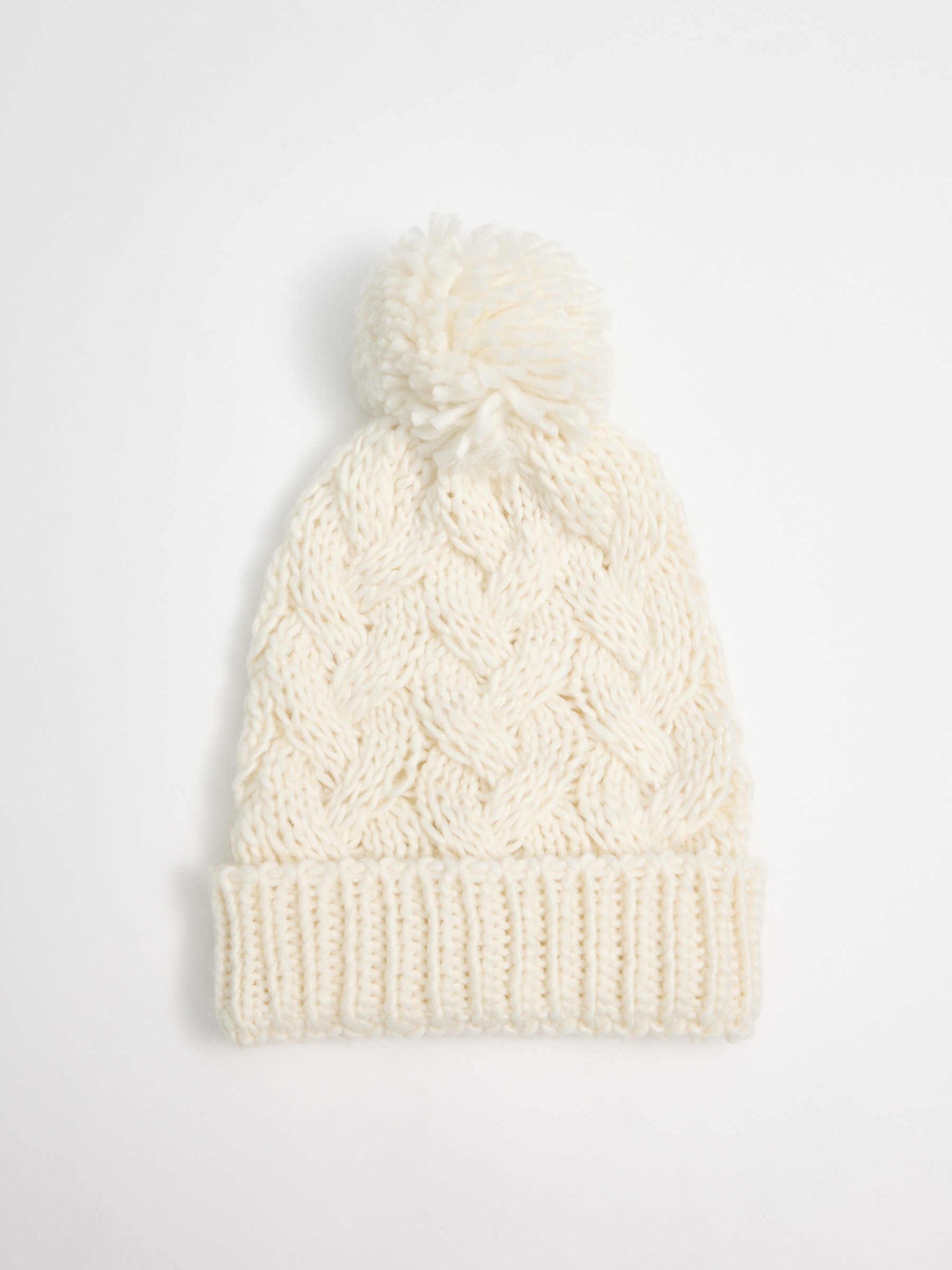 O gorro trançado com pompom é confeccionado em 100% acrílico, o que proporciona grande conforto. Seu tecido trançado é adornado com um pompom da mesma cor branco marfim. Este gorro é perfeito para complementar seus looks mais invernais.