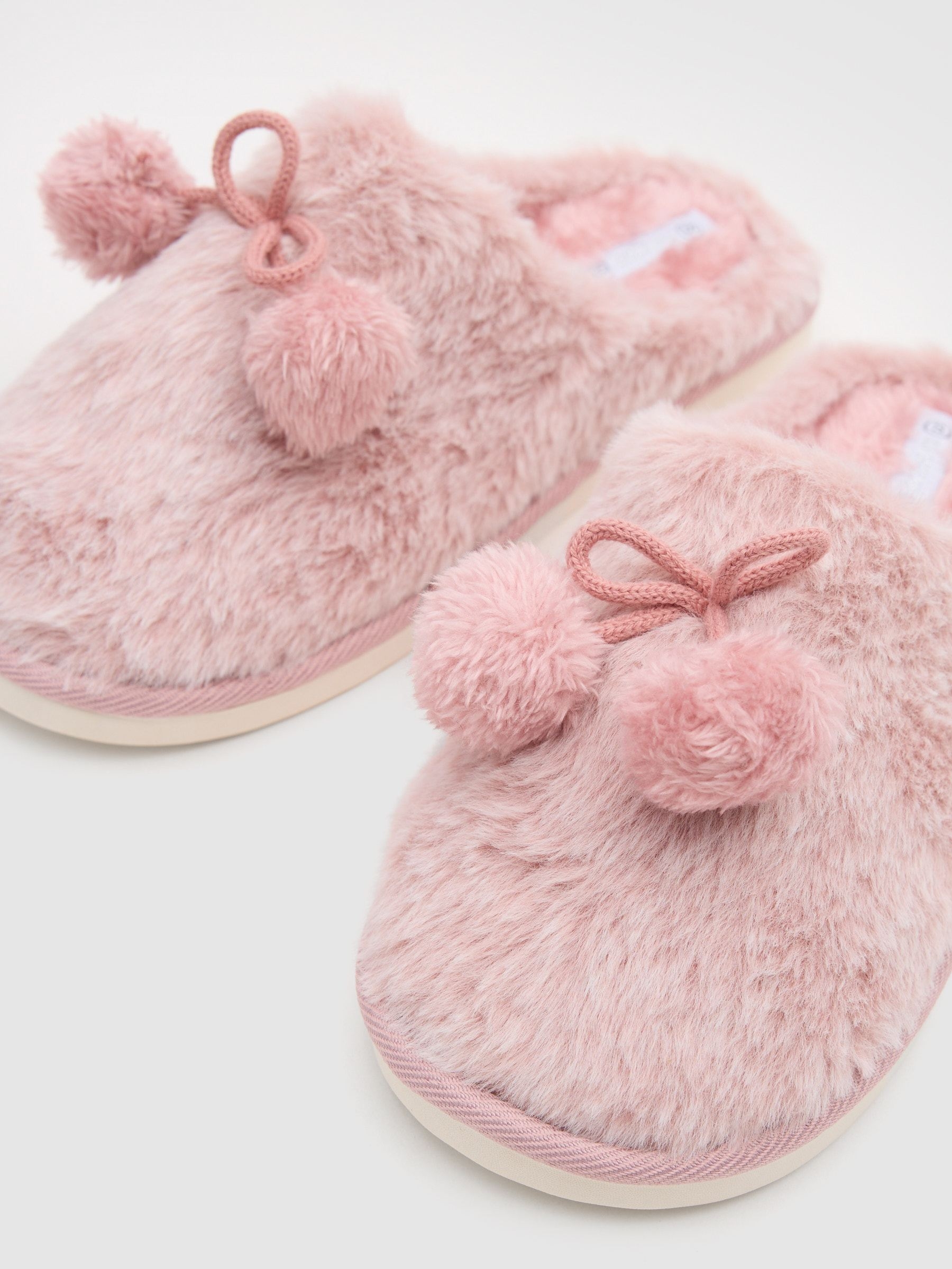 Pantufas com forro de pelo macio. Exterior em efeito pelo com pompons decorativos.