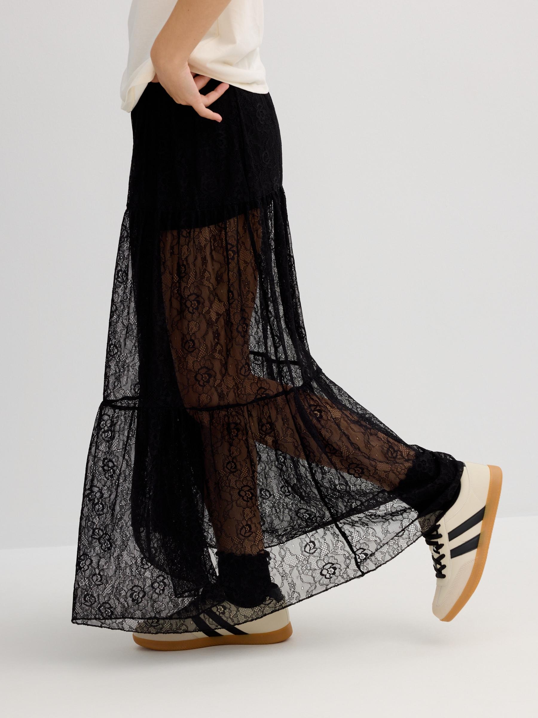 Saia midi fluida de tecido transparente de renda. Com forro interior tipo saia curta combinada a tom. Fecho através de cintura elástica.