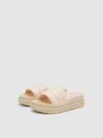 Deslumbre com esta tanga de plataforma com plataforma. Fabricada em tecido de couro envernizado com design entrançado. Sola plana de borracha. O sapato perfeito para as jovens que querem estar na moda sem renunciar ao conforto.