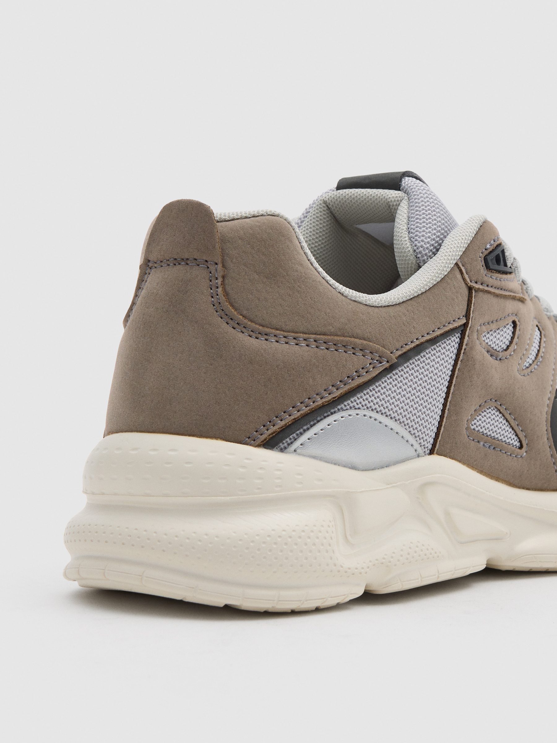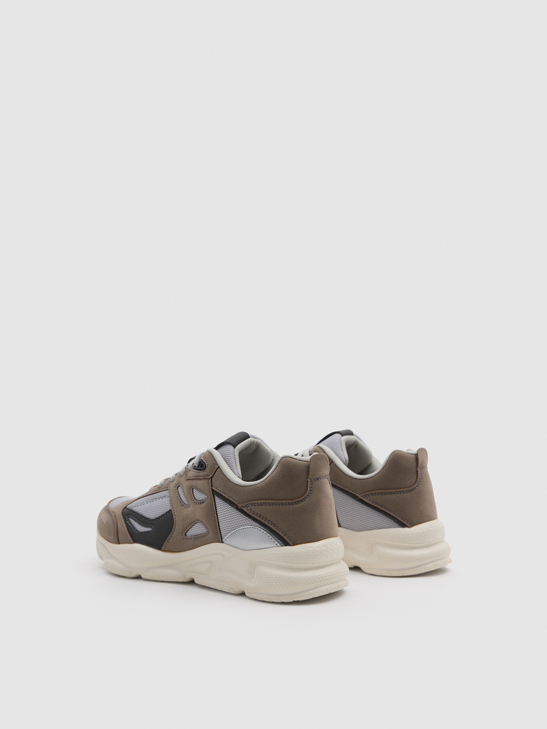Ténis tipo running com combinação de materiais e peças no corte. Puxador traseiro. Sola grossa com design. Fecho através de atacadores.