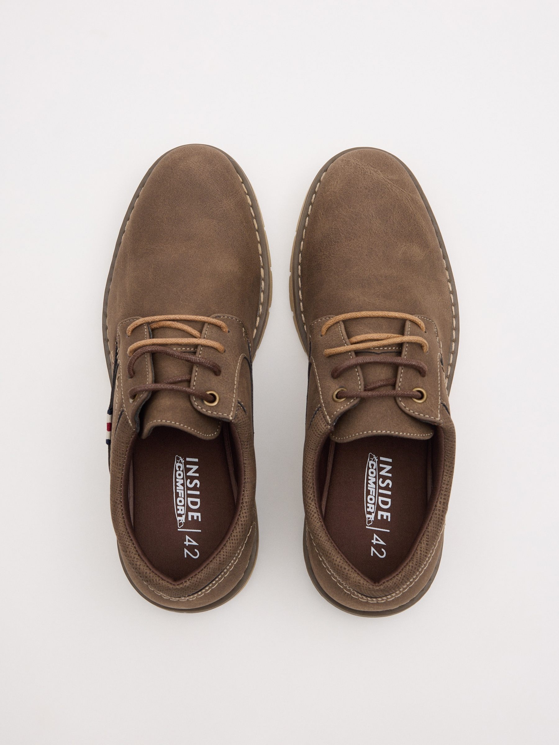 Sapato clássico confeccionado com tecido de pele sintética. Fecho através de atacadores, com duas opções de tom diferentes. Sola de borracha ligeiramente dentada.