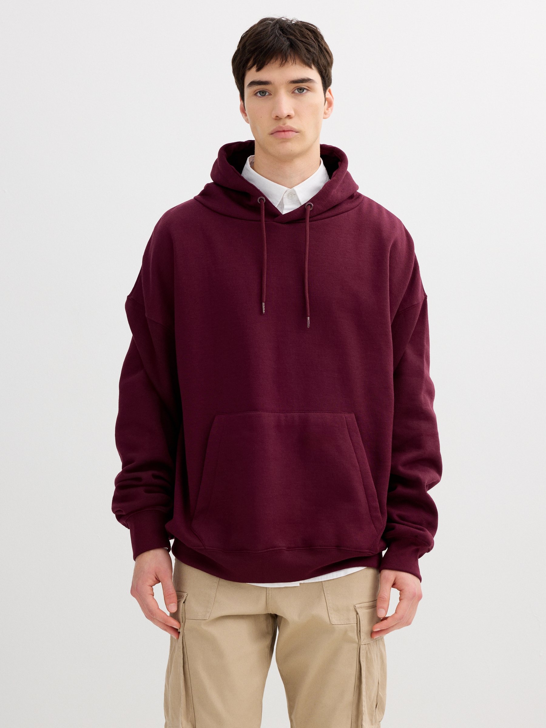 Camisola básica de manga comprida com capuz, em tecido de pelúcia, ajuste regular, bolso canguru à frente e acabamento canelado.