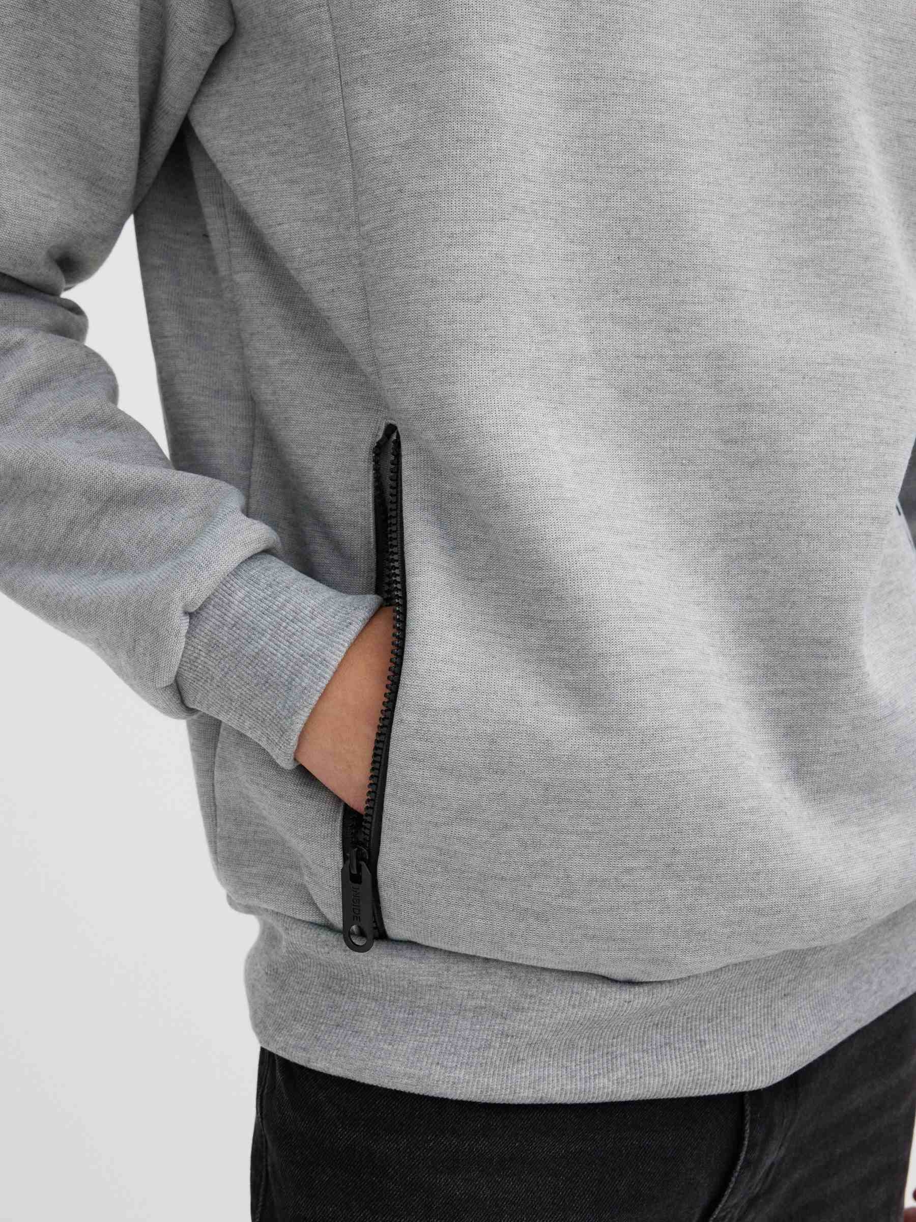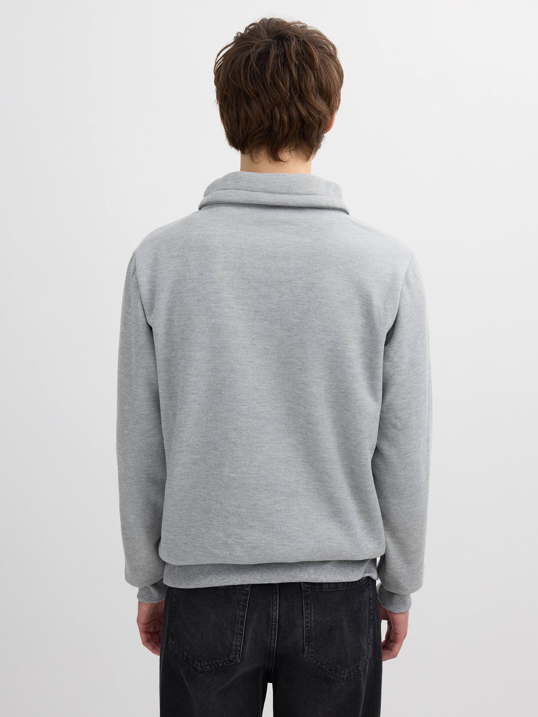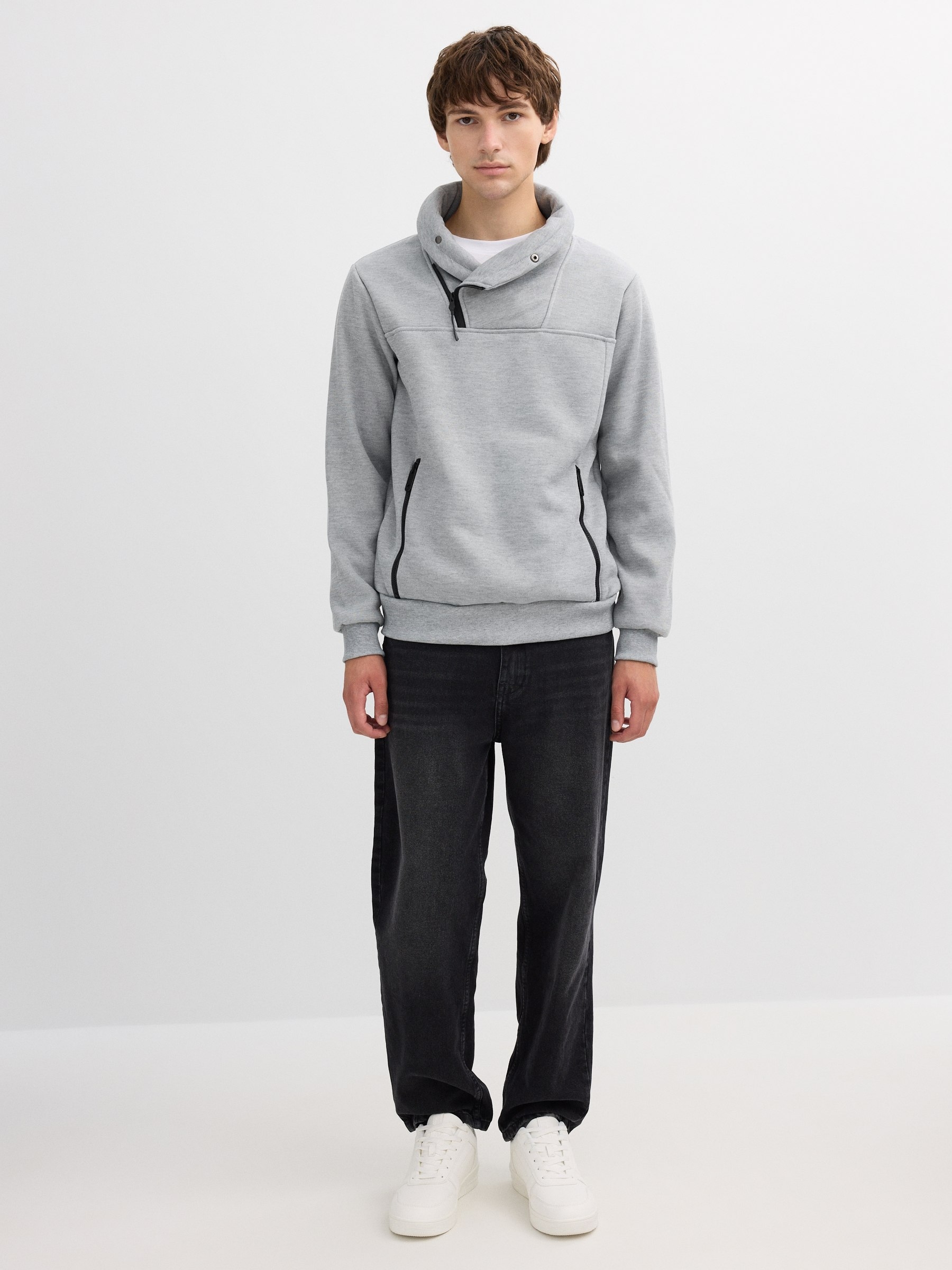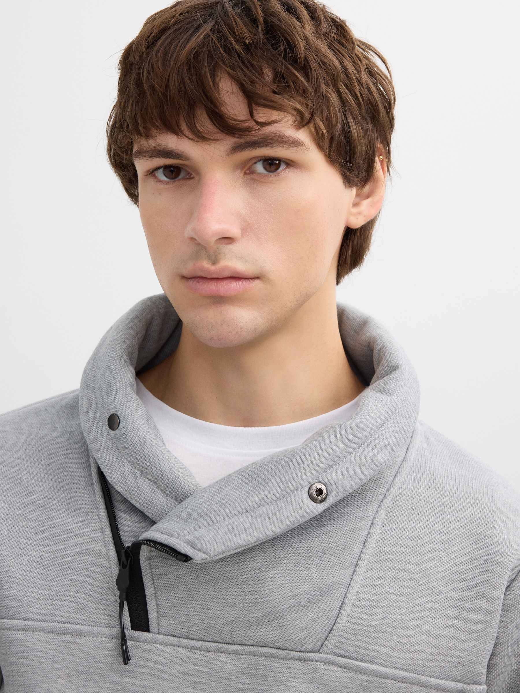 Moletom fechado de manga longa. Gola alta com fechamento por colchete e zíper. Tecido de felpa e estilo esportivo. Com dois bolsos laterais com zíper. Punhos e cintura em ponto elástico.