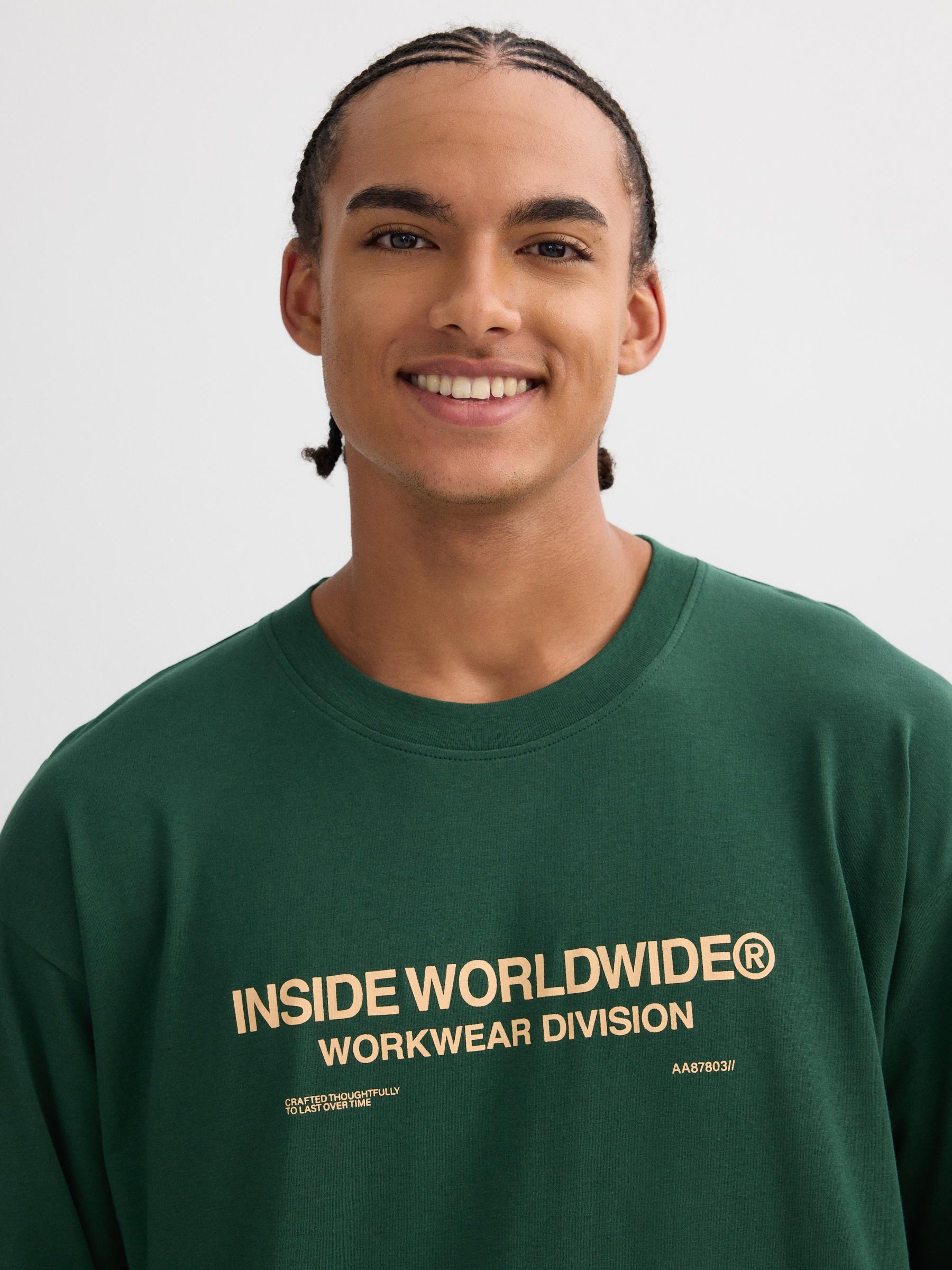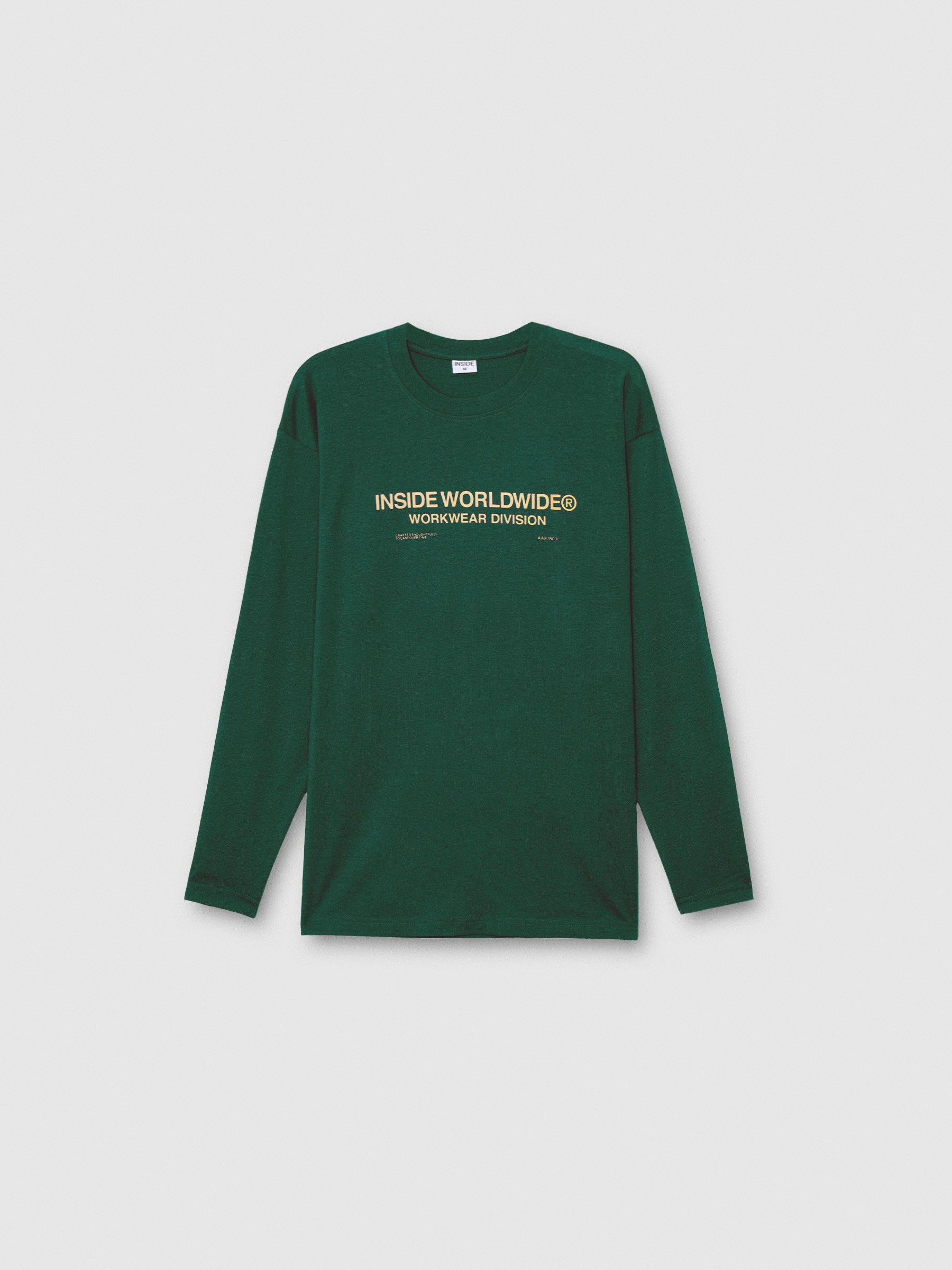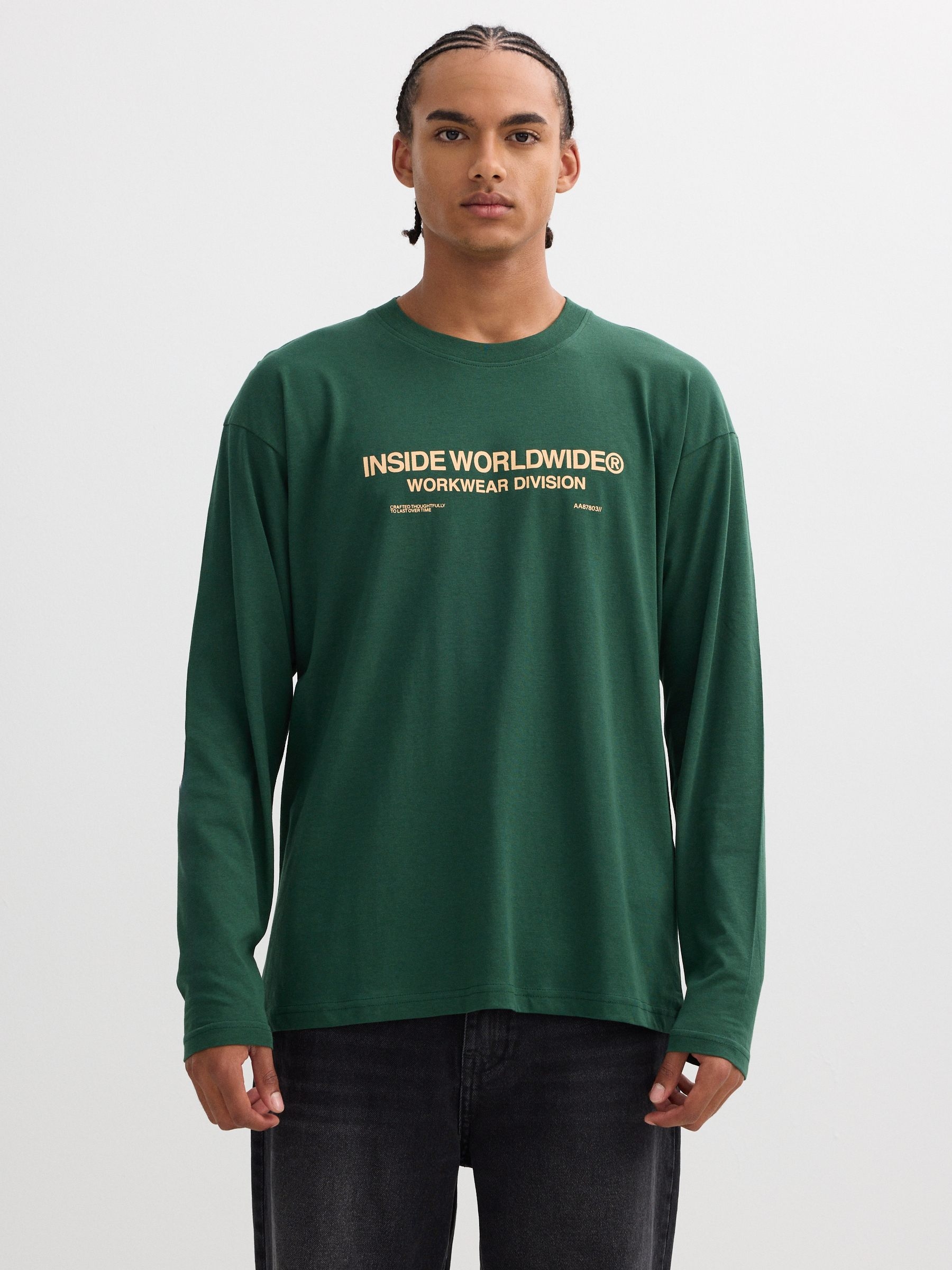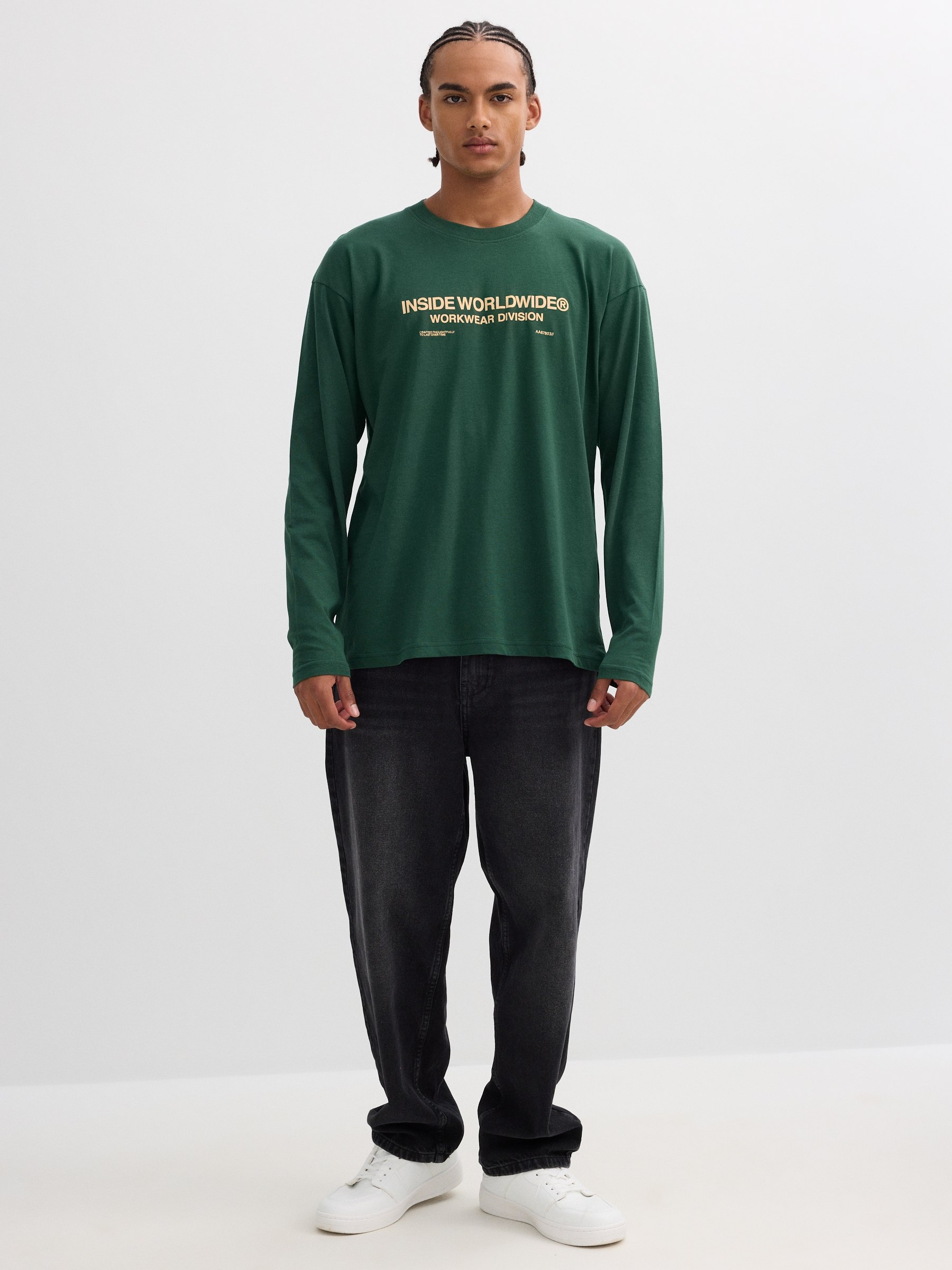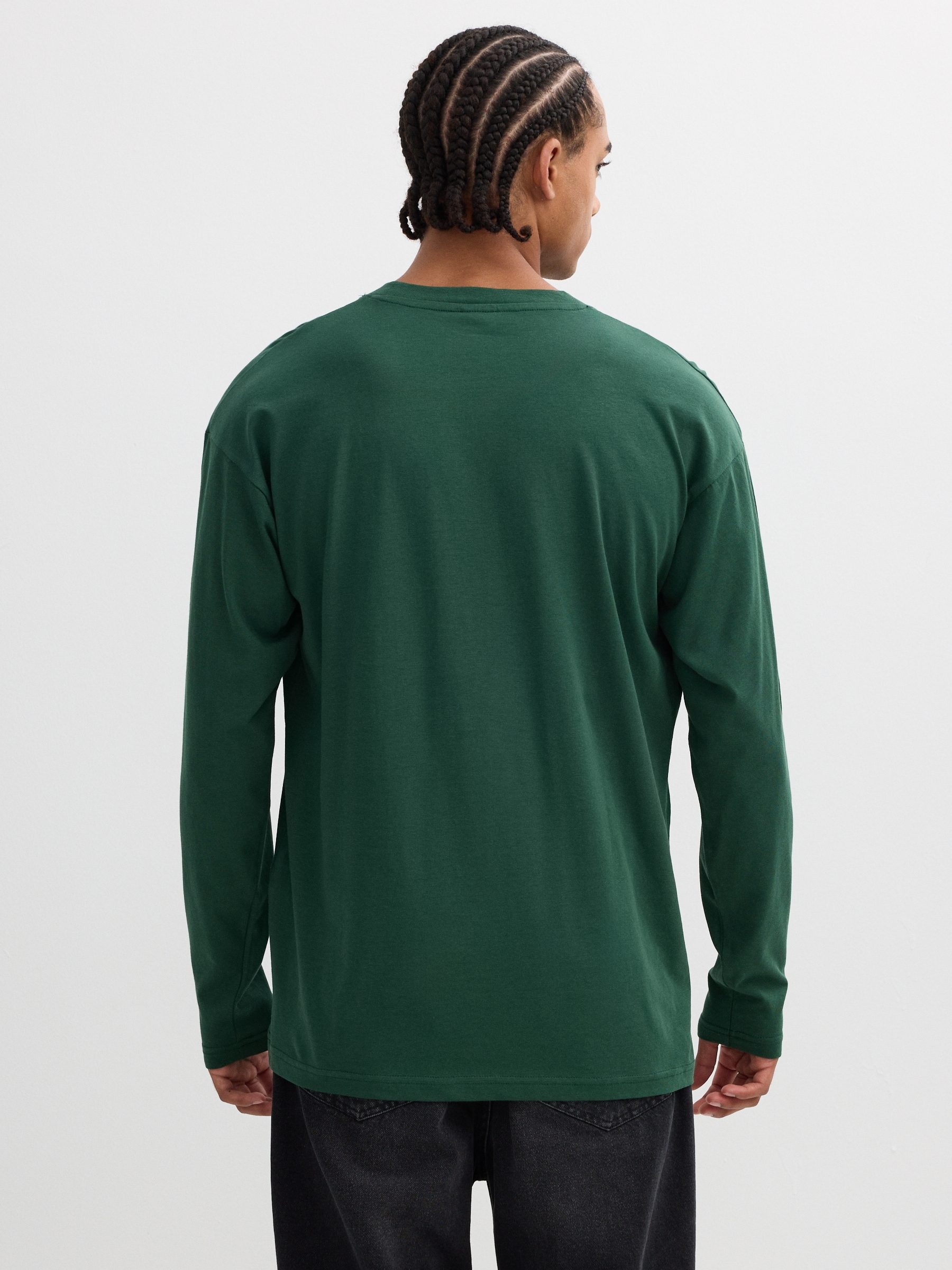 Camiseta 100% algodão de manga longa e gola redonda. Design frontal com texto. Corte oversized.