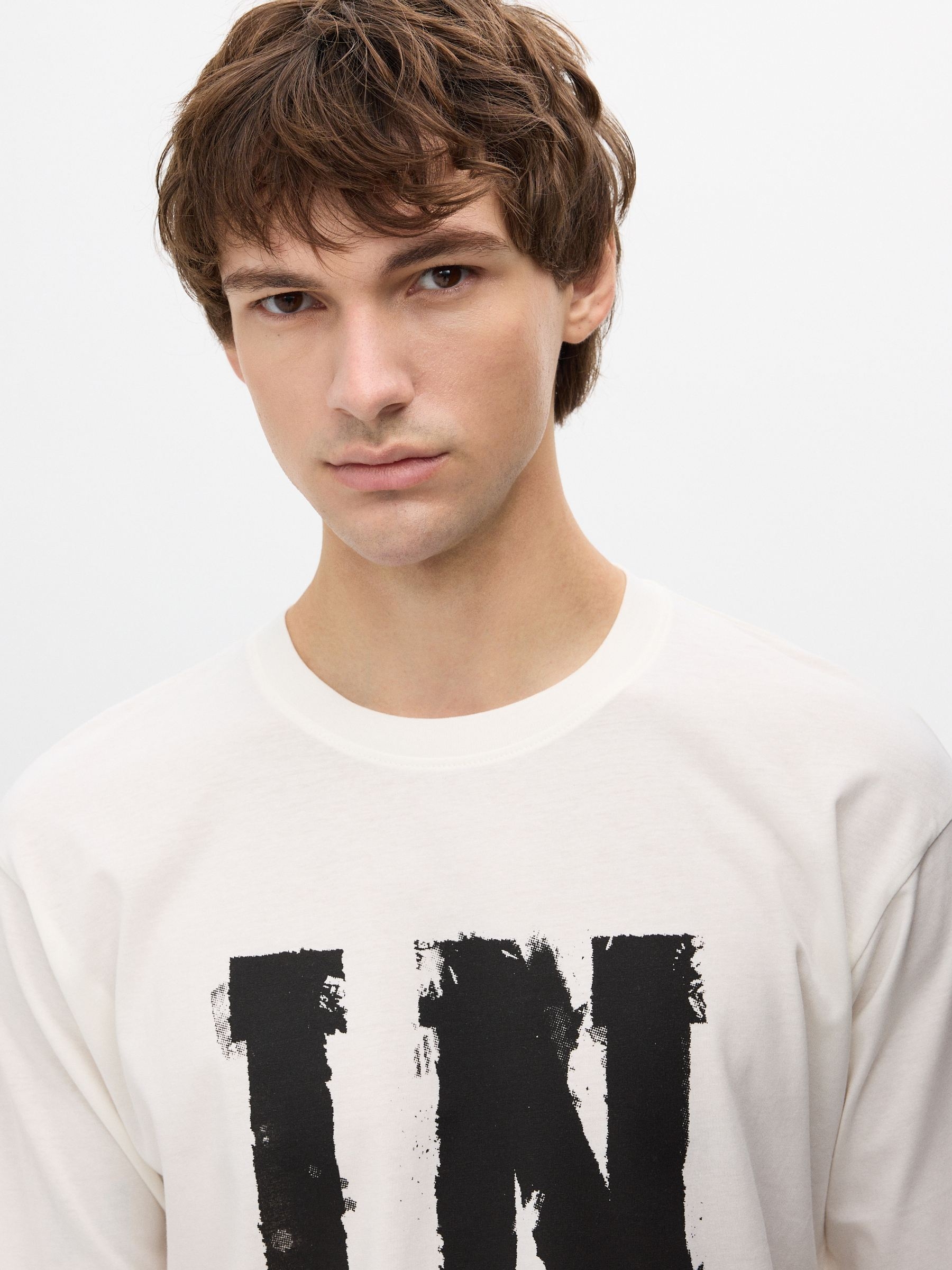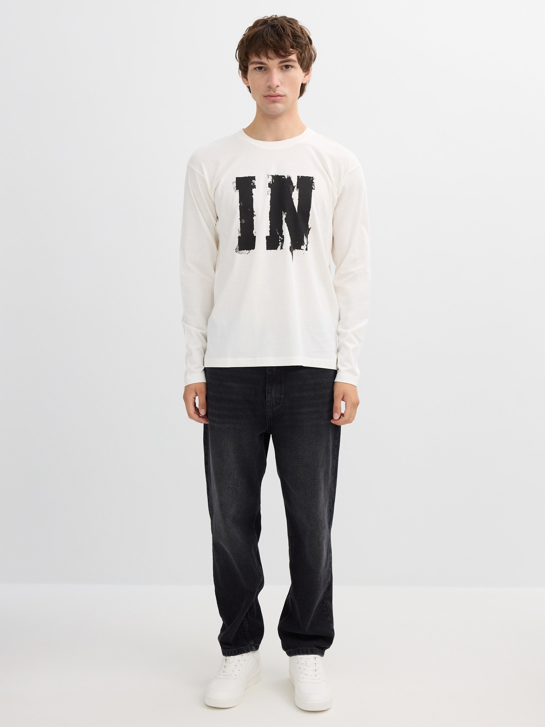 Camiseta 100% algodão de manga longa e gola redonda. Design frontal com letras. Acabamentos em ribana.
