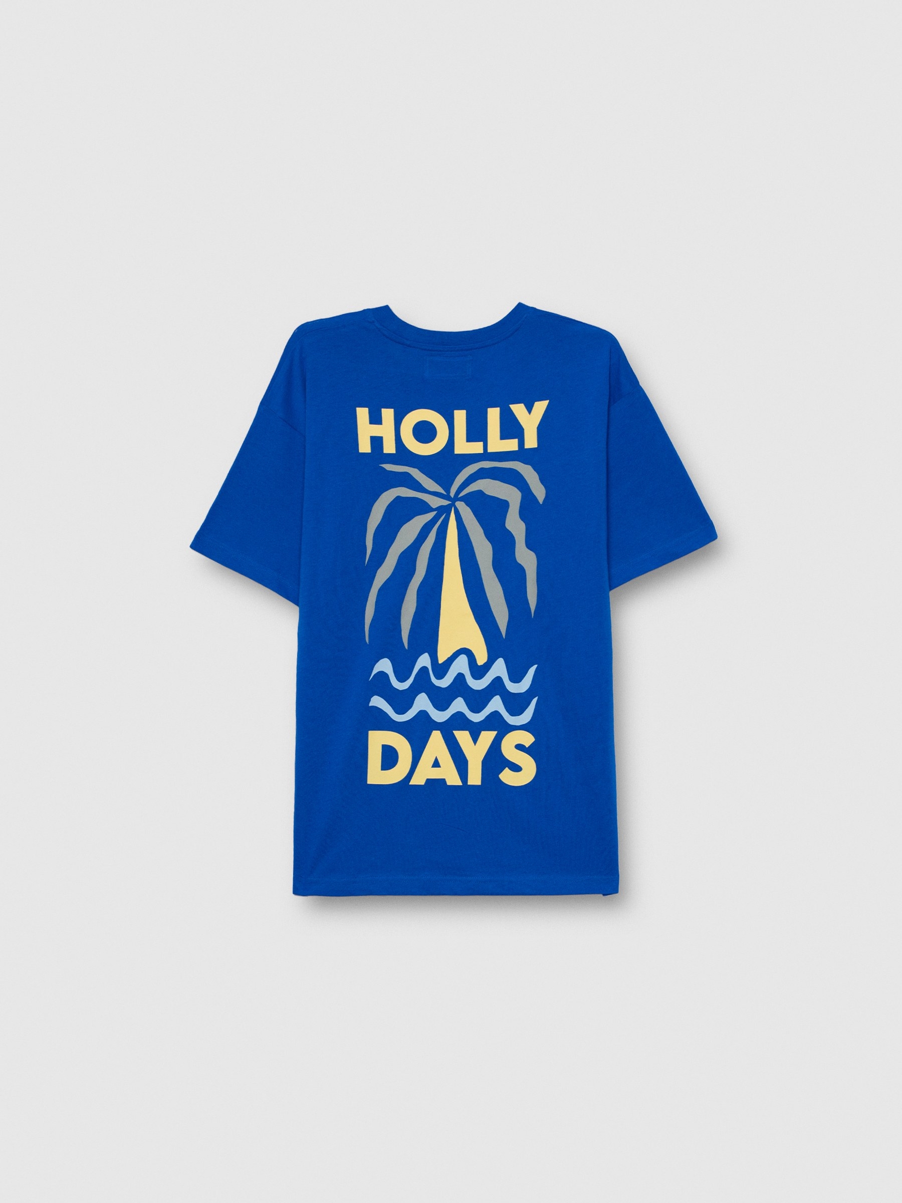 Camiseta estampada Holly Days confeccionada em algodão, apresenta um design de palmeira com letras grandes nas costas que proporcionam um ar gráfico muito chamativo. Tem manga curta, gola redonda e um corte amplo que garante liberdade de movimento. Ideal para combinar com bermudas ou jeans.