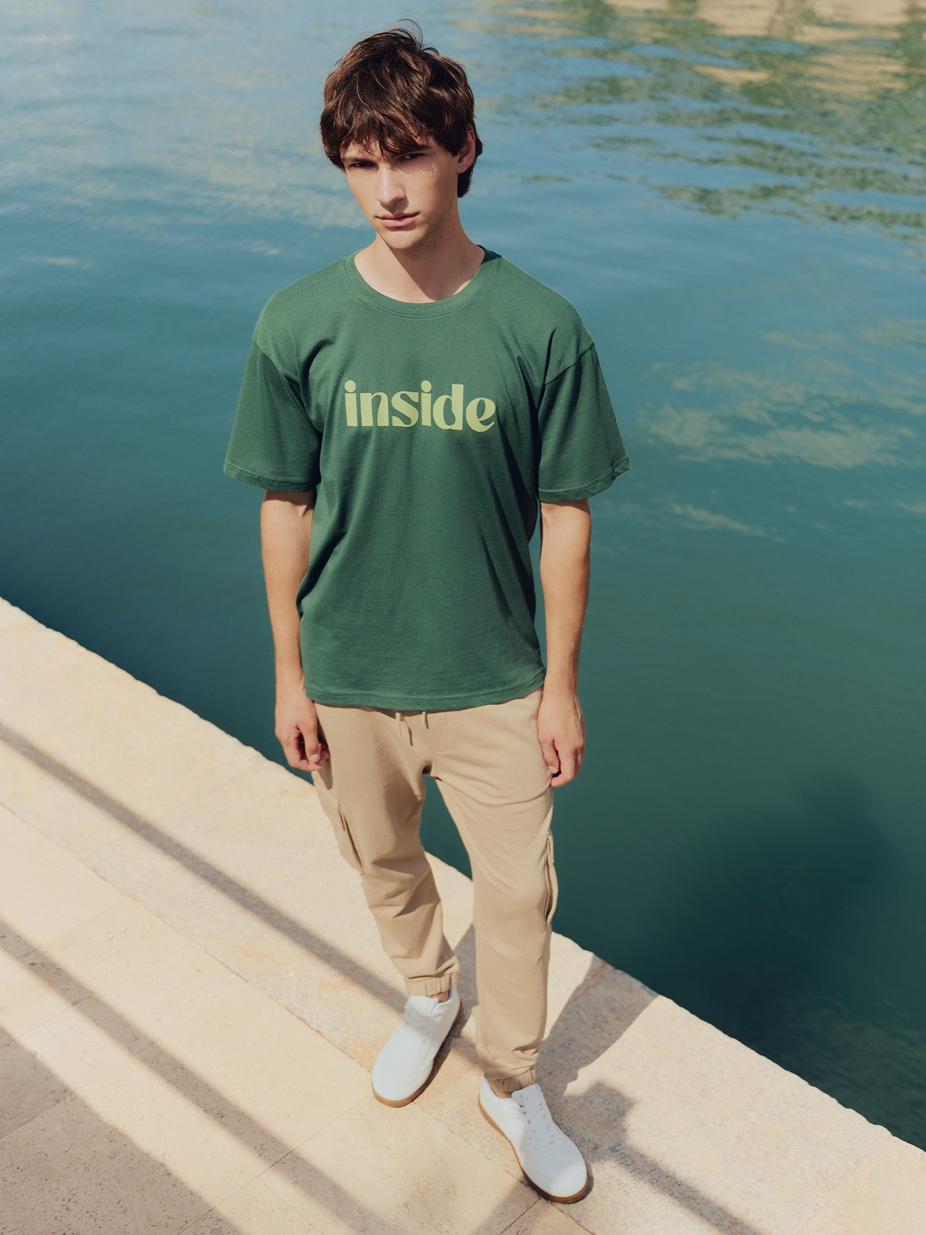 Camiseta 100% algodão. Gola redonda, manga curta e corte oversize. Detalhe de estampa frontal de texto.