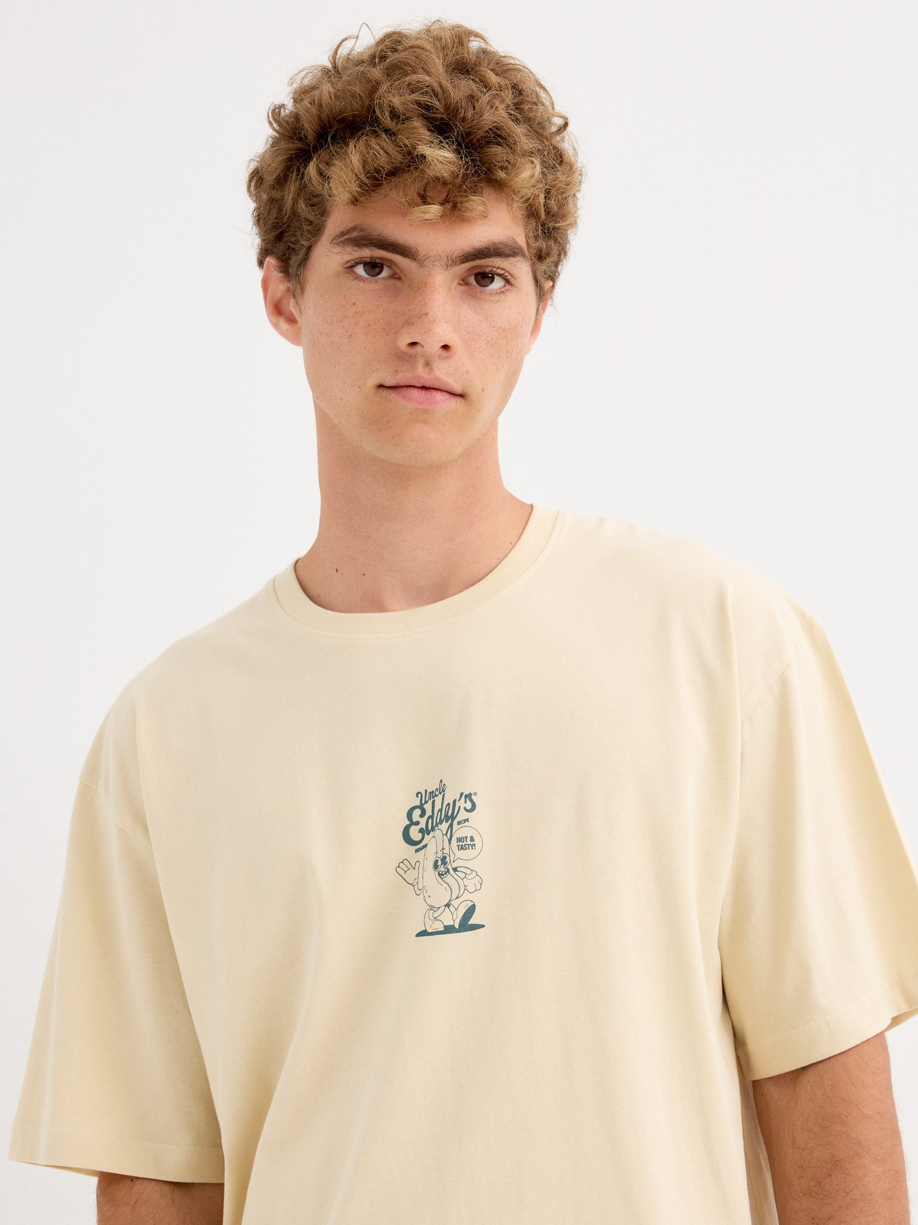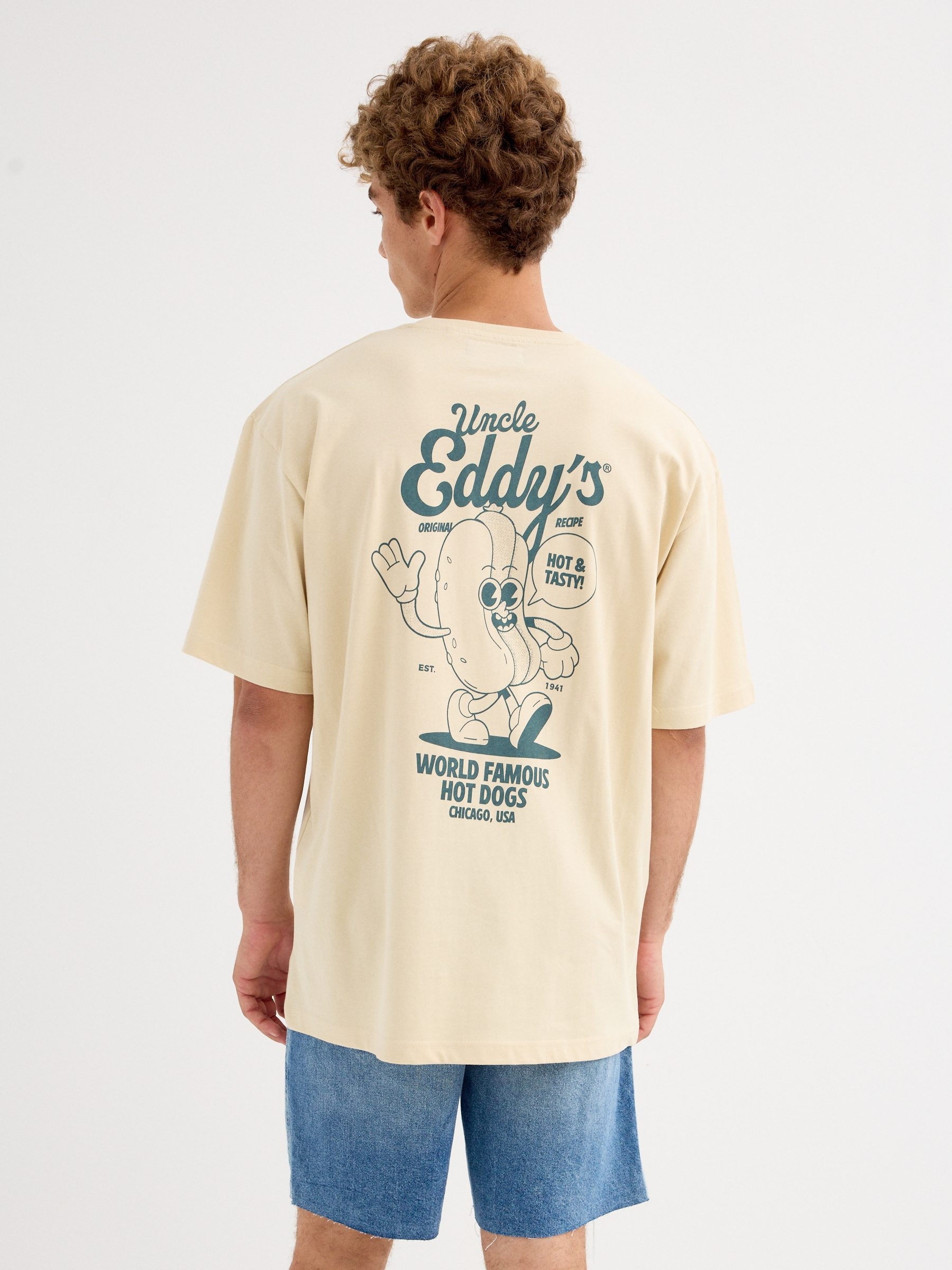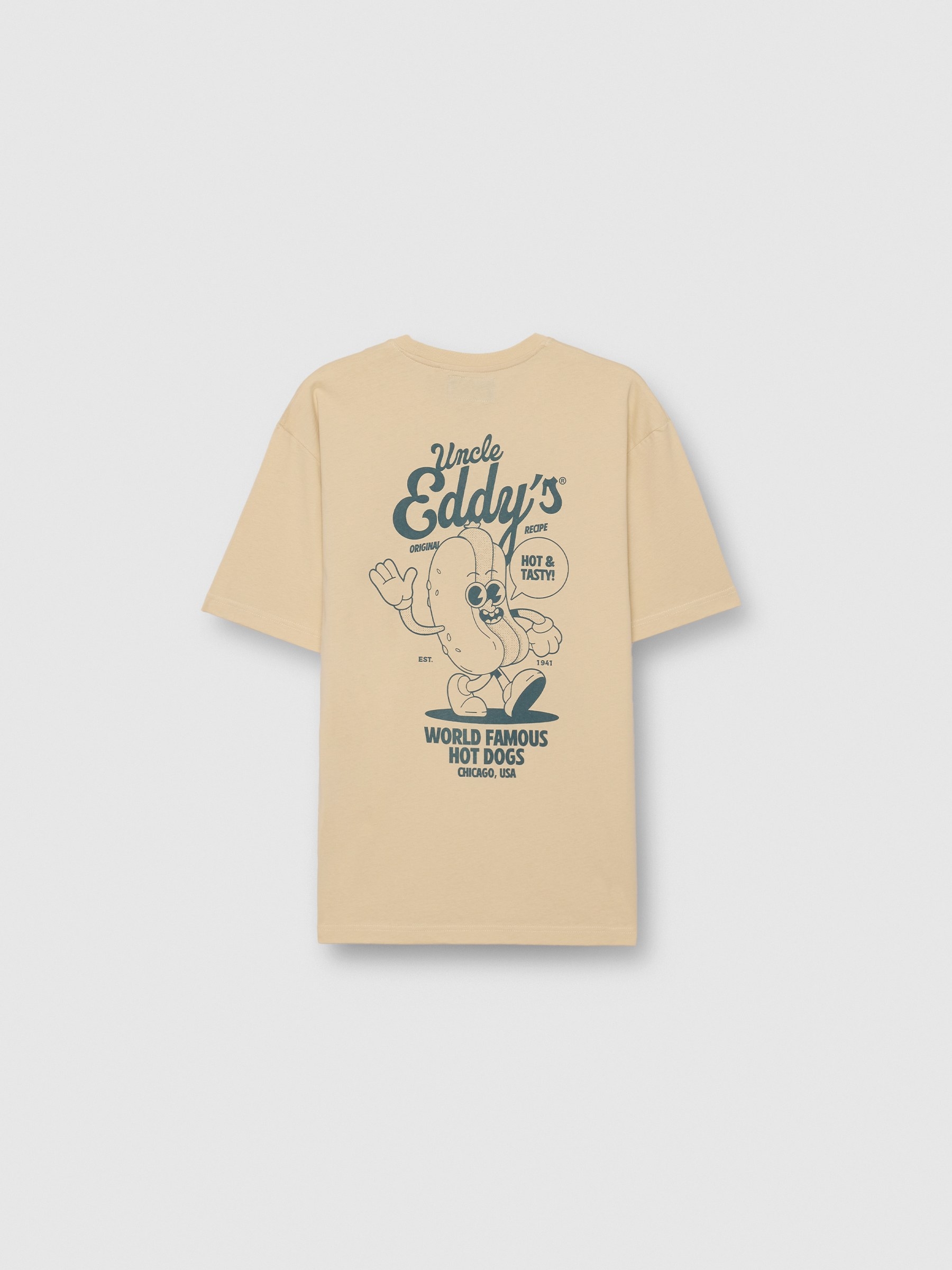 Camiseta estampada Uncle Eddy na cor areia, confeccionada em algodão com toque suave. Apresenta um design gráfico de estilo retrô inspirado em uma barraca clássica de cachorros-quentes, com mensagem impressa nas costas e detalhe frontal combinando. É de manga curta, gola redonda e corte amplo, combinando com bermudas, jeans ou calças fluidas para um look urbano.