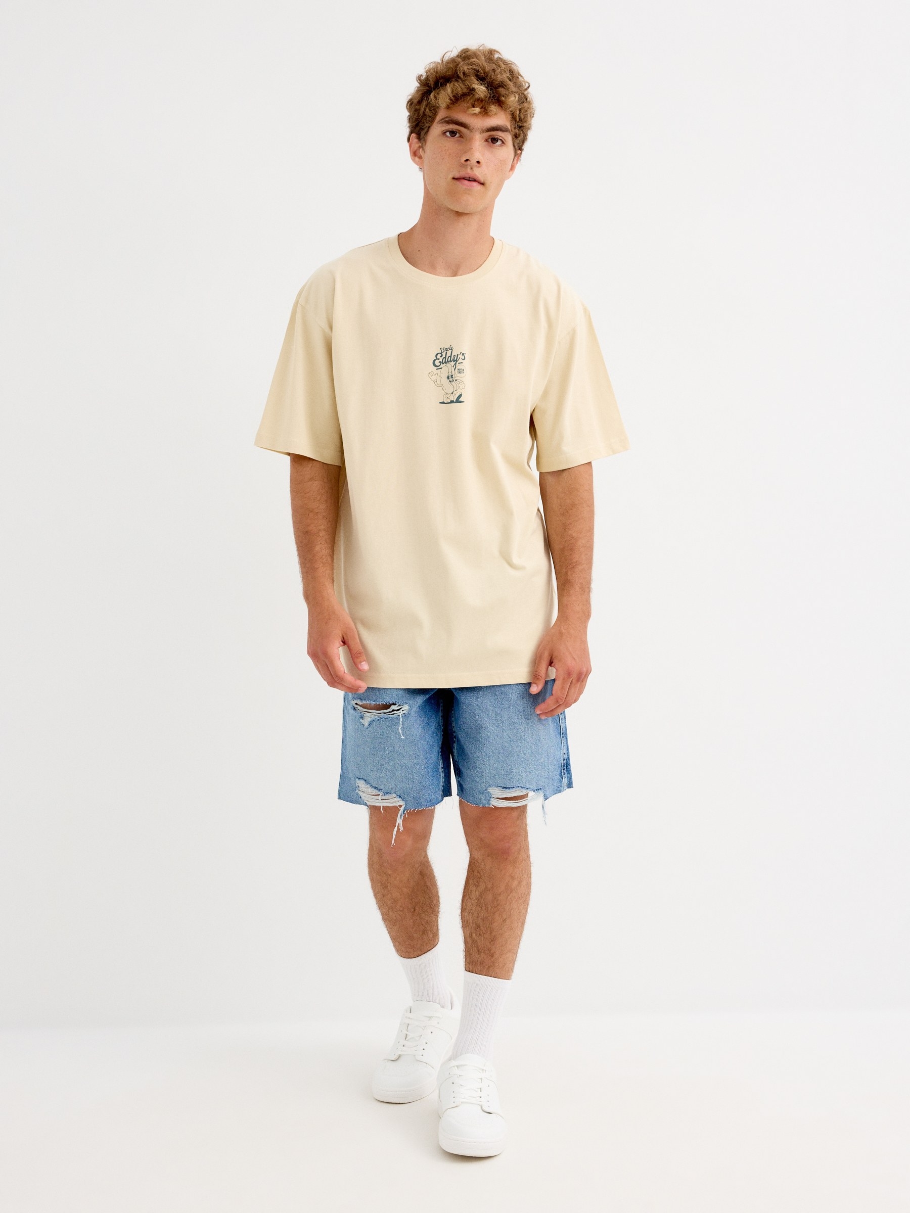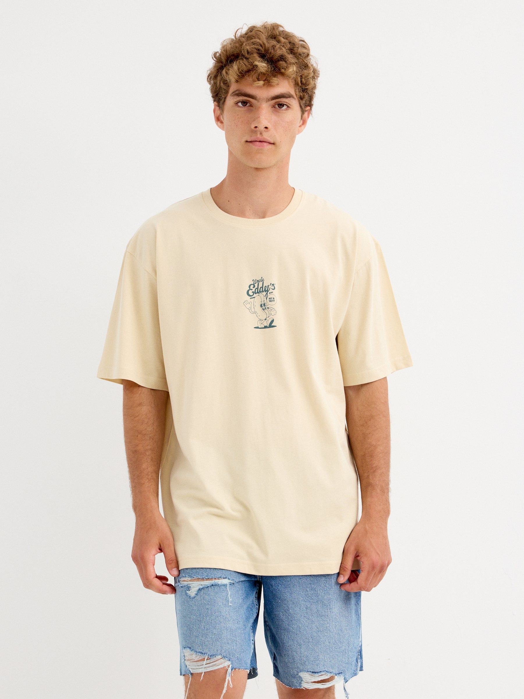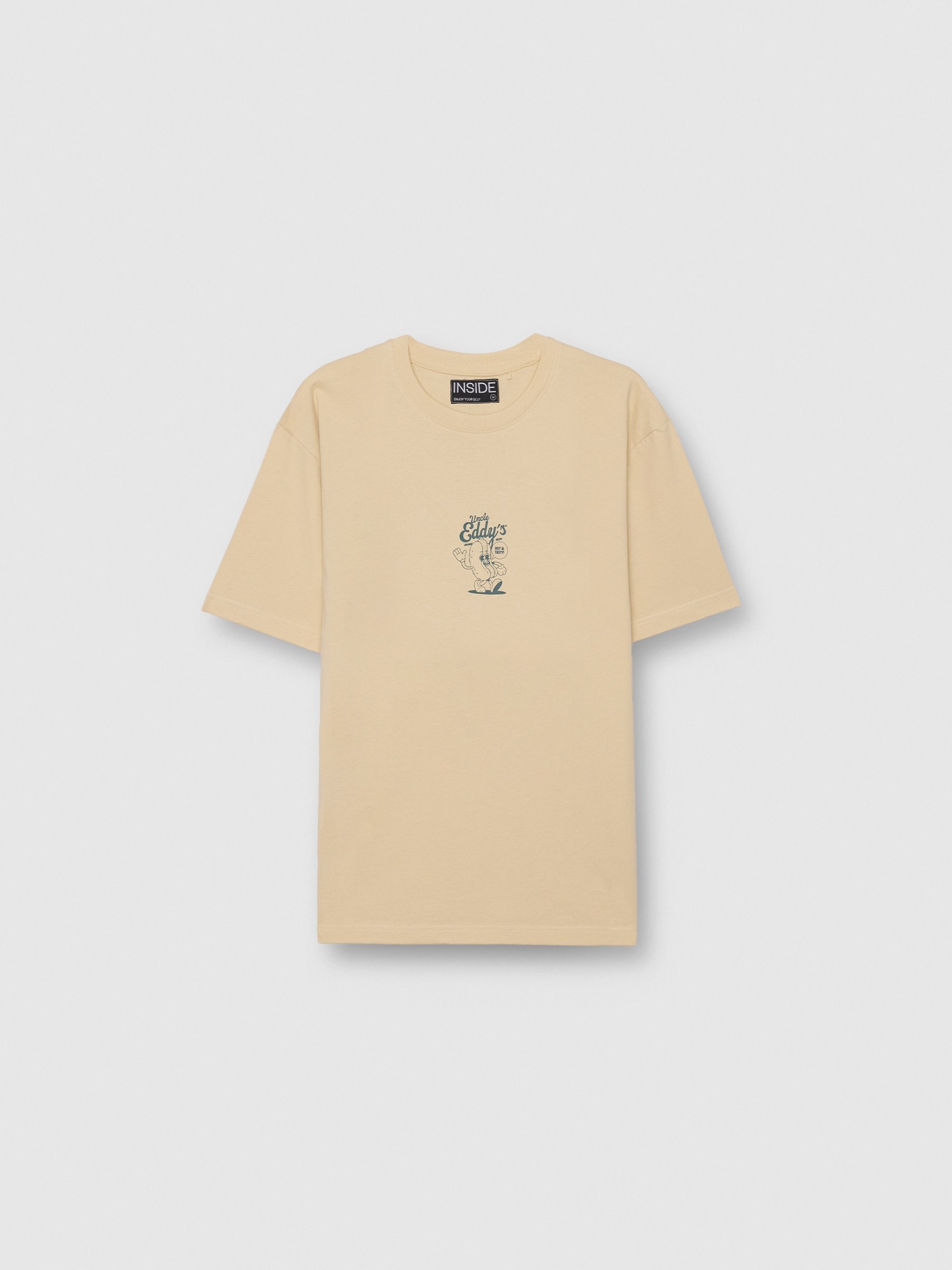Camiseta estampada Uncle Eddy na cor areia, confeccionada em algodão com toque suave. Apresenta um design gráfico de estilo retrô inspirado em uma barraca clássica de cachorros-quentes, com mensagem impressa nas costas e detalhe frontal combinando. É de manga curta, gola redonda e corte amplo, combinando com bermudas, jeans ou calças fluidas para um look urbano.